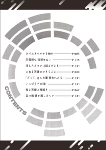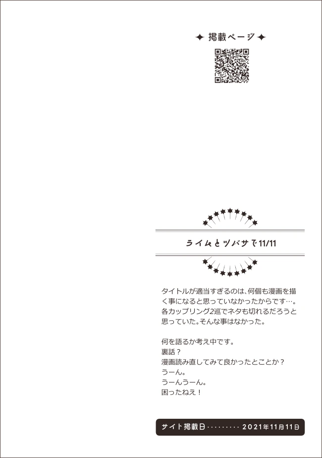 瑪瑙と琥珀の話である【注したラインを越えずとも】も右ページ開始なんですが、扉絵ではなく冒頭1Pのモノローグを追加したので、掲載ページの方も反映しておきました。もくじ(暫定)と作品ごとのあとがきページ。
