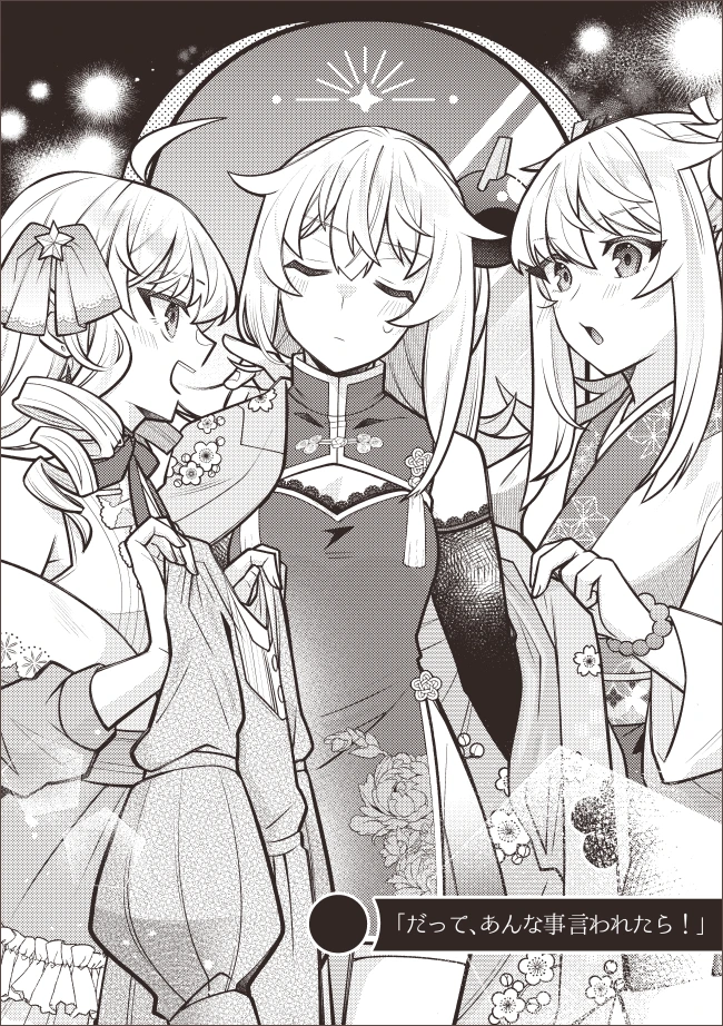 いや~生殺与奪の権を完全に握ってる状態って気分がいいなぁ!最高!入稿するかしないかは私の気分次第なんだ。してもいいししなくてもいい。好きに出来るんだ。もう完成してるからね!………アッ、後書きの文章……適当にいれたままだ……変えなきゃ……。真の意味での後書きになって丁度いいね。≪「だって、あんな事言われたら!」≫ の扉絵。本編 ⇒ 2コマ漫画 ⇒ 扉絵 の時系列です。女子トリオでキャッキャしてる絵を描くの初めてでは……?あと双子とツバサの身長差を描くのも初?