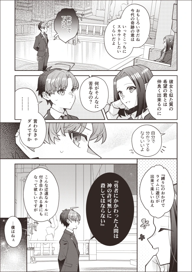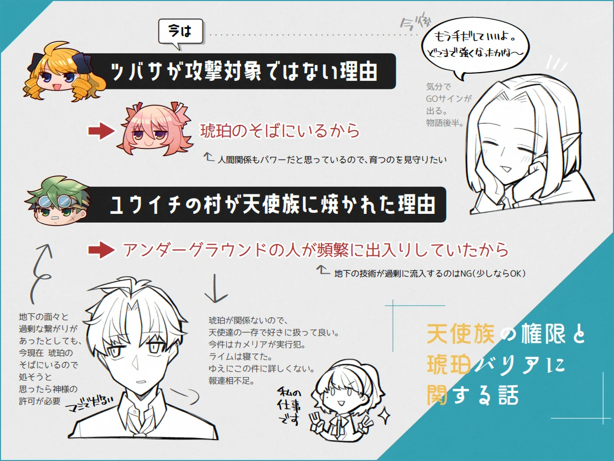 そして『勇者にかかわった人間』の定義ですが、こちらも厳密に管理はしていません。「家族・親戚」「勇者が住んでる街の住人」「(ライムが)観察するようになってから関わった人間」という大雑把なカテゴライズで運用しています。フルフルがこのラインだよって決めたわけではなく、天使たちが手探りでまあこんなもんかなって決めた。上司が気分屋だと色々と難しい。
