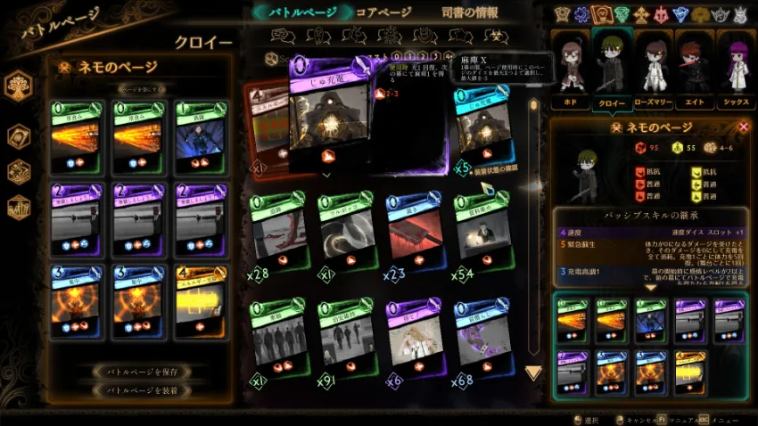 核となるコア(職業)を選び、そこに9枚のカードを装着します。攻撃特化のカードを中心に編成するのか、はたまた防御に特化するのか。キャラAは攻撃だったからキャラBはそれを補助する形でデッキを組んで……などなど考える事・できる事の幅がとんでもなく広い!