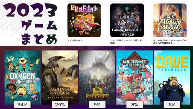 ゲームジャンルとしては多種多様に色んな作品を遊んだなぁと。RPGをめったにやらない私が、年に3本もJRPGをやっているのがもはや奇跡よ。その代わりに、経営シミュ系のゲームにガッツリハマる事はありませんでした。意図的に手を出していないのはある、無限に遊んじゃうから(※2023年9月のONI)。