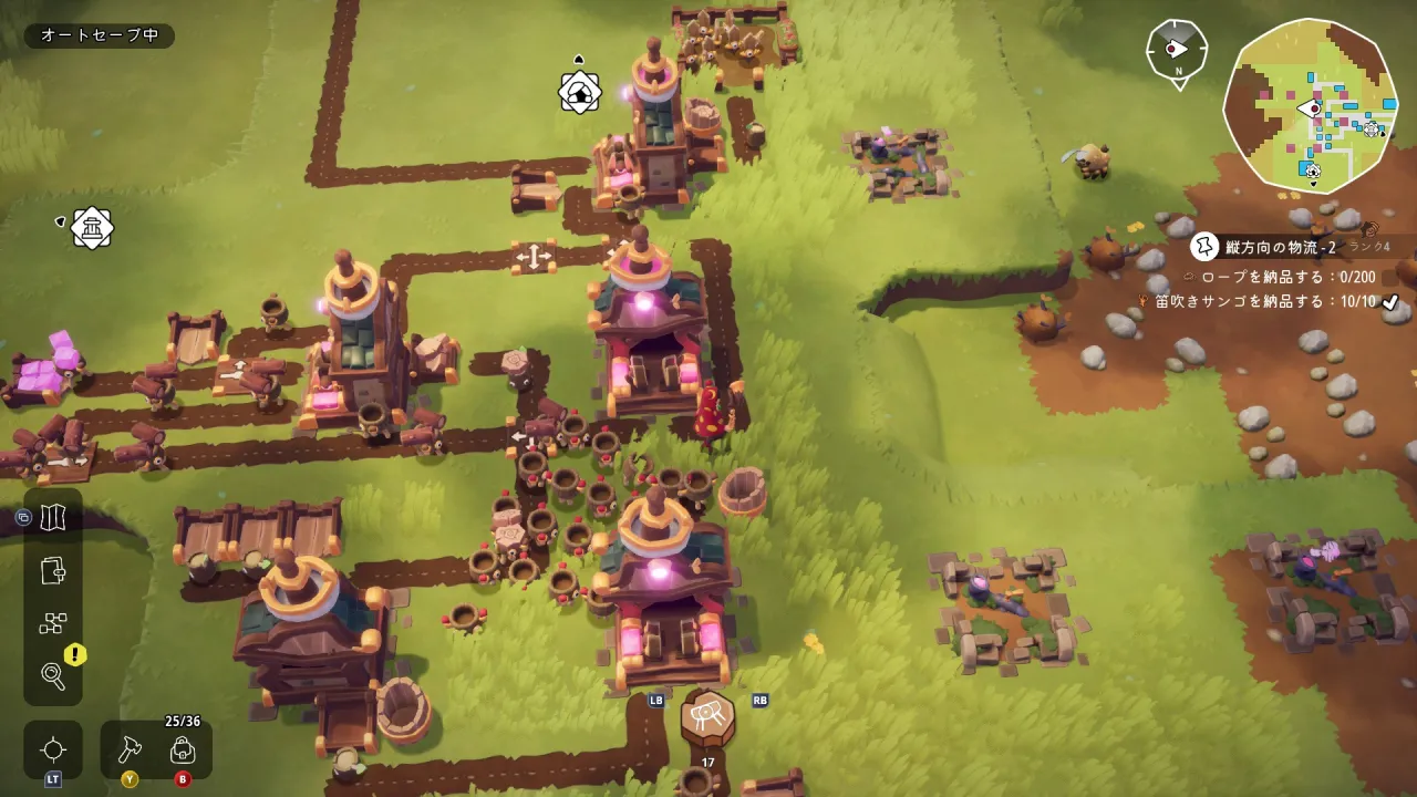 閃きによるアハ体験ではなく、自分がせっせコツコツと積み上げて来たものに対する恍惚を得られるのが楽しかったです。整備した道を使い、よいしょこらしょとスパークが物資を運ぶ。生産施設でアイテムを作って、そのアイテムをまた運んで、どんどんどんどん物を増やしていく。その流れを見てニヤニヤしちゃいました。それとただ単純に、小さきものがちょこまか働いてる姿って癒されるんだよな~!