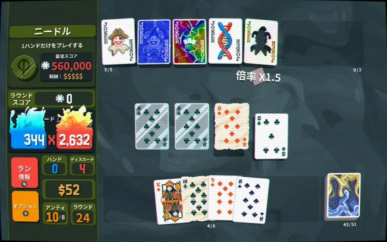 基本はポーカー、というかゲームルールとしては現実のトランプと一緒です。役を作って、ステージ毎に設定された得点ノルマをクリアしていく。3ステージに1回、特殊ギミック(特定の柄が使用不可・自分の手札が見えない等)があるものの、やっていく事は役作りだけ。