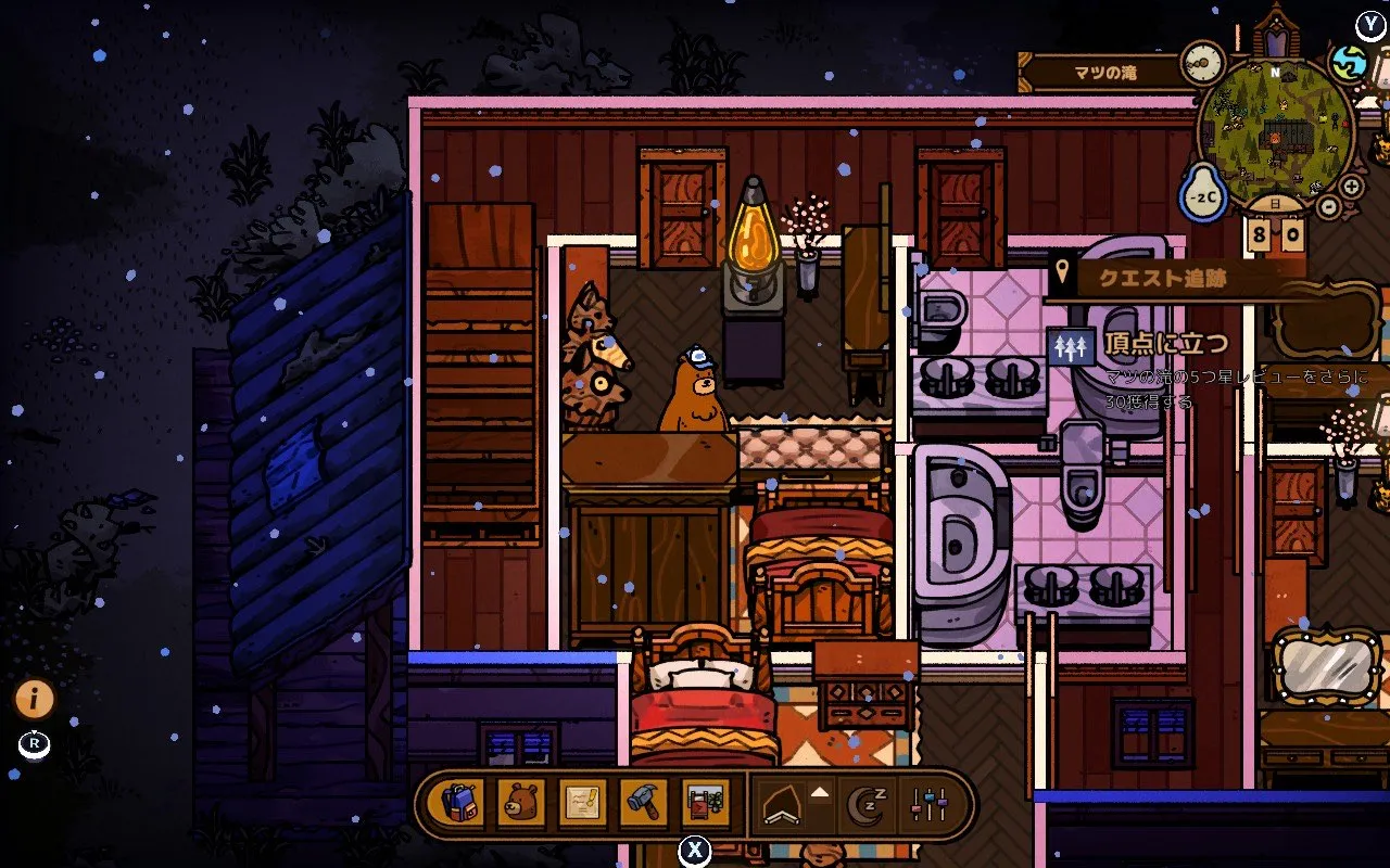 経営といいつつも難しい事は一切ないので、盆栽を育てる感覚で遊べます。公式の映像ではレイアウトの自由性をうたっているけど、効率を重視すると特定のアイテム設置に収束するから【どうぶつの森】的なモノを求めている人はガッカリするかも。経営を求めてもデザイン性を求めても「それは違うよ!」ってなるけど、なんかこう、遊べてしまう魅力があるというか……。クマが可愛いからかな。