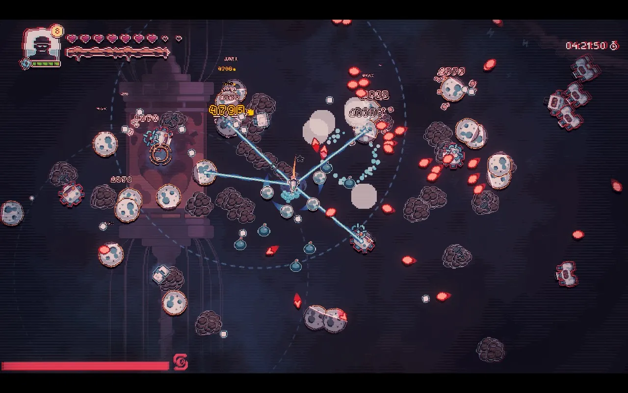 【スペルトナエル】は『謎解き』×『高難易度デッキ構築』×『ローグライト』の要素を持ったインフレ脳汁弾幕アクションゲームです。こっくりさんよろしく、文字盤を駆け回って魔法を発動していきます。あまりにも数が多すぎる魔法をどう使っていくかがカギになっており、にっちもさっちもいかないビルド構築要素に頭を悩ませることとなります。