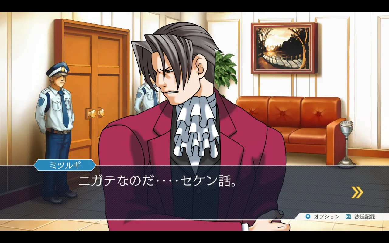 前置きが長くなってしまった。【逆転裁判】は法廷でドンパチするアドベンチャーゲームです。証拠集めの探索パートが怠いです(ぶっちゃけ)。前回も……若かりし頃にやった頃も裁判ではなく探索パートの複雑なフラグ管理についていけず投げ出した事をプレイしていて思い出しました。具体的に言うとトノサマンのところです。あっちこっち行かされるの、どのゲームでも嫌い!