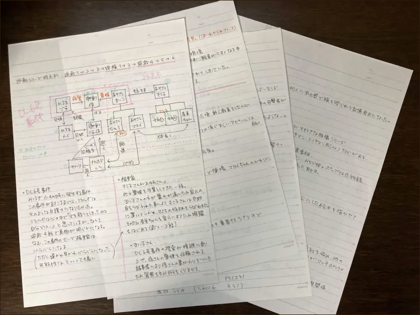 愛じゃろ?すごくない?手書きで。私のために。ただ弓彦に会わせたい一心でシリーズの解説をルーズリーフに。これにビックリしちゃって、嬉しくて、自分で逆転裁判をやろうと決めました。