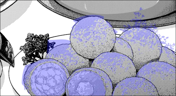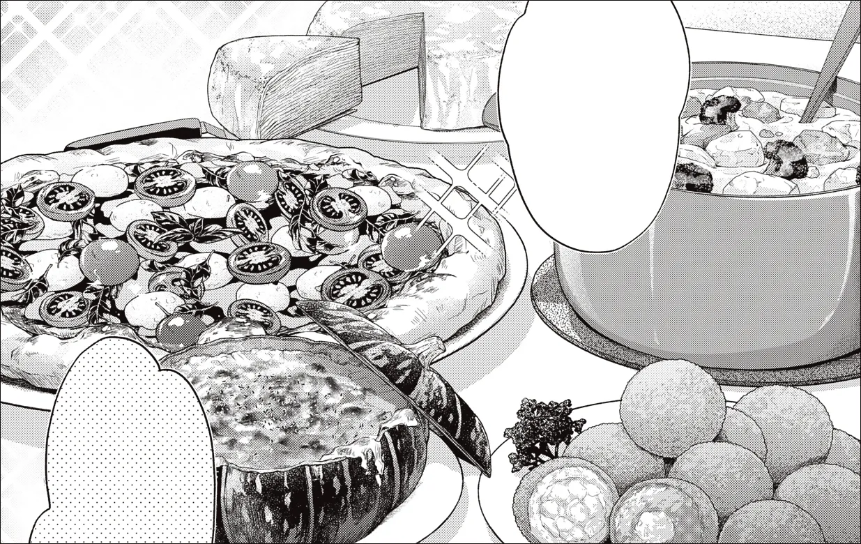 すごくないですかこのご飯のクオリティ。2巻からずっと、ご飯の絵が美味しそうなところは彦坂さんの作品です。ベタとトーンの塩梅が作風にマッチしているのも凄い……!画面に自然になじんでいて、浮いていないんだもん。私が3D使って仕上げしてるところやっぱり浮いちゃうからな~……観察眼に自信ネキはぜひ「これはささら餅」「これは別の人」ゲームをしてもろて。